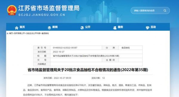 中国质量新闻网讯 2025年10月27日,江苏省市场监督管理局发布关于20批次食品抽检不合格情况的通告(2025年第35期)。通告称,近期,江苏省市场监督管理局完成食品安全抽检任务670批次,涉及餐饮食品、调味品、糕点、酒类、粮食加工品、肉制品、乳制品、食品添加剂、食用农产品、食用油、油脂及其制品、水果制品及饮料等食品。根据食品安全国家标准检验和判定,其中抽样检验项目合格样品650批次、不合格样品20批次,情况如下: