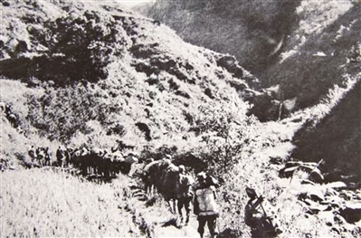 当时敌人紧追不舍,两位战士见状,一个拉着他的手,一个抬着他的脚,连蹦带跳地跃下了梯田,才得以脱险。