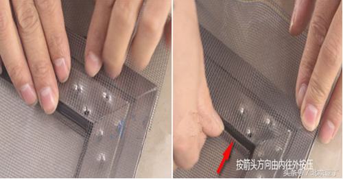 5、压边条处理:先压短边,压完一边再压另一边短边,压边时由内向外压,这样容易绷紧纱网,避免出现压不紧等松垮现象。