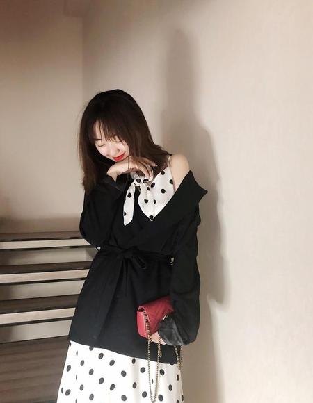 黑色给人一种气场很强大的感觉,融入波点元素之后,时尚感就非常强。好像在告诉别人,老娘最酷!走路都带风呢。所以这种波点裙最适合酷女孩了。