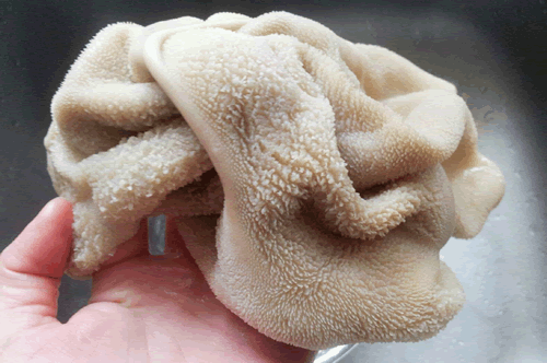 2、用手搓洗,洗去羊肚内外黏液。被白醋和食盐浸泡后的羊肚因为被白醋软化了,食盐渗透压逼出腥水过,所以可以轻松搓洗掉羊肚表层黏液;