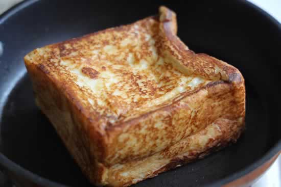 3、平底锅预热,溶化一块黄油,把吐司放进去,中火煎,大约2分钟左右翻个面,继续煎,侧面也要煎一煎,把每面煎至这样金黄色就可以了。