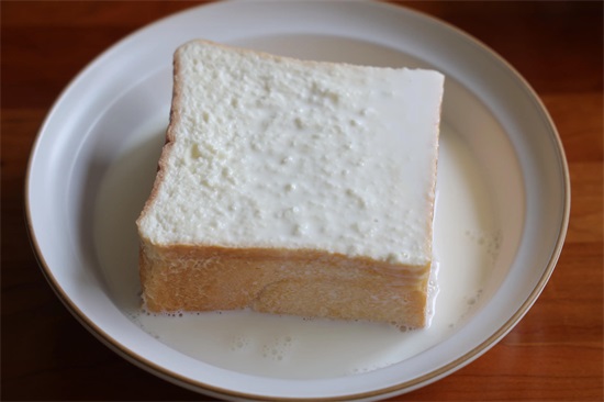 2、放在深一点的盘子里,浇上牛奶,让吐司吸饱牛奶,翻个面继续吸饱牛奶,按压吐司会有牛奶流出来,这样就可以了。