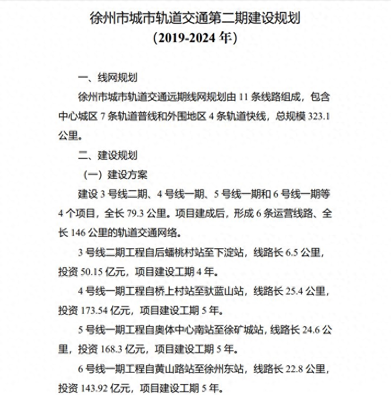 一、为更好支撑徐州城市功能区发展,提升公共交通服务水平,完善城市综合交通运输体系,原则同意徐州市城市轨道交通第二期建设规划,建设3号线二期、4号线一期、5号线一期、6号线一期等4个项目,规划期为2019-2024年。