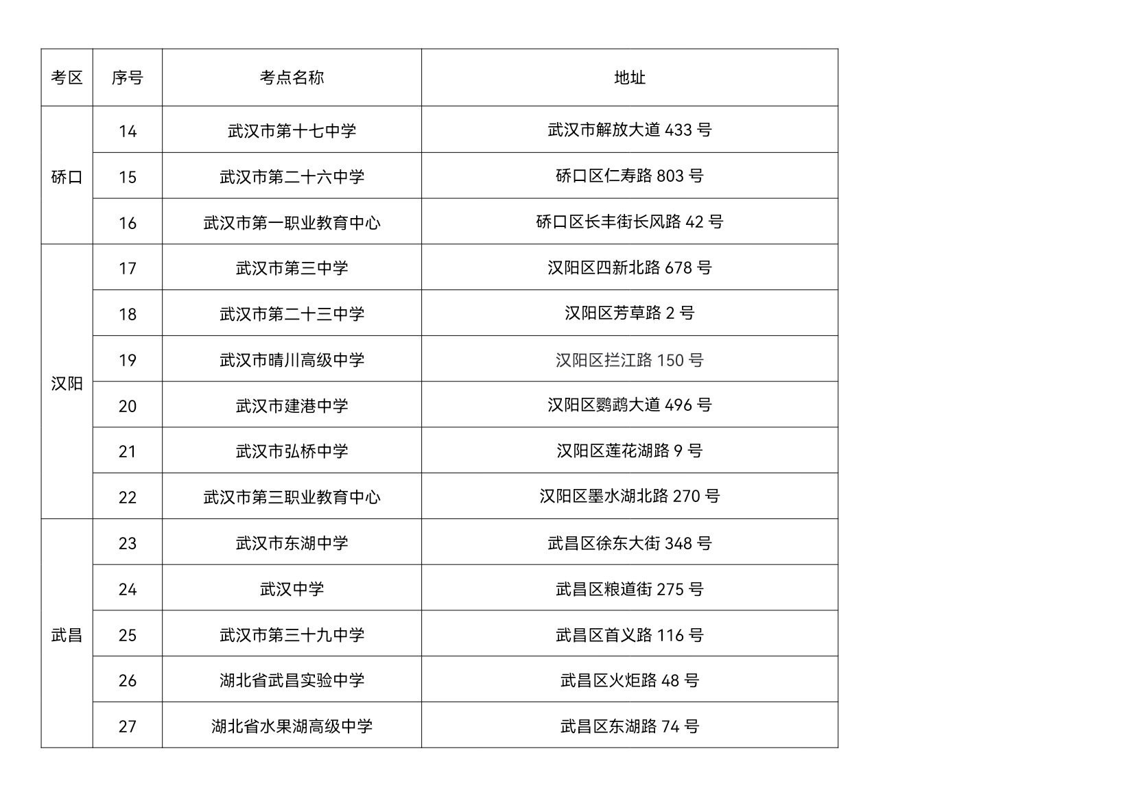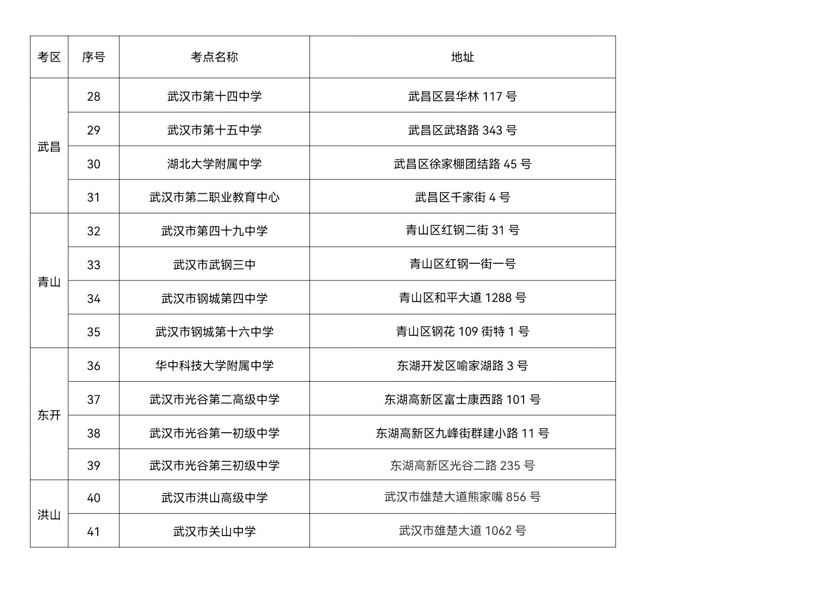长江日报大武汉客户端6月1日讯(记者刘嘉)6月7日,武汉市6.35万名高考考生将迎来高考。今年,武汉市共设64个高考考点,具体考点和地址如下: