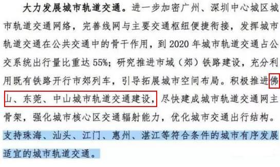 据广东省发改委、广东省交通运输厅联合发布的《广东省综合交通运输体系发展“十三五”规划》显示,广东将支持珠海/汕头/江门/惠州/湛江等符合条件的城市有序发展适宜的城市轨道交通,积极推进佛山、东莞、中山城市轨道交通建设。