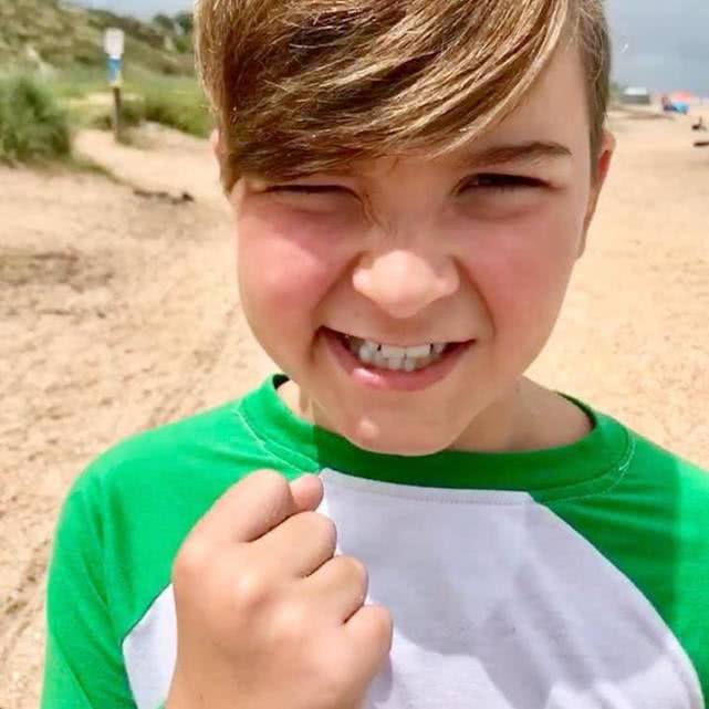 在海边玩得嗨了,萨米突然抓起一把沙子,想要送到嘴里,却被大人喝止,于是便形成了这幅握拳打气的画面。
