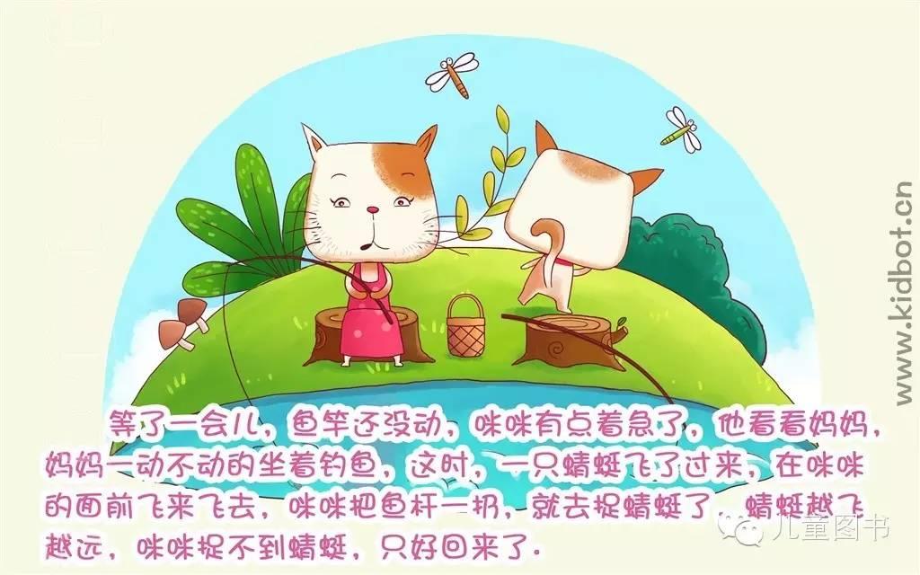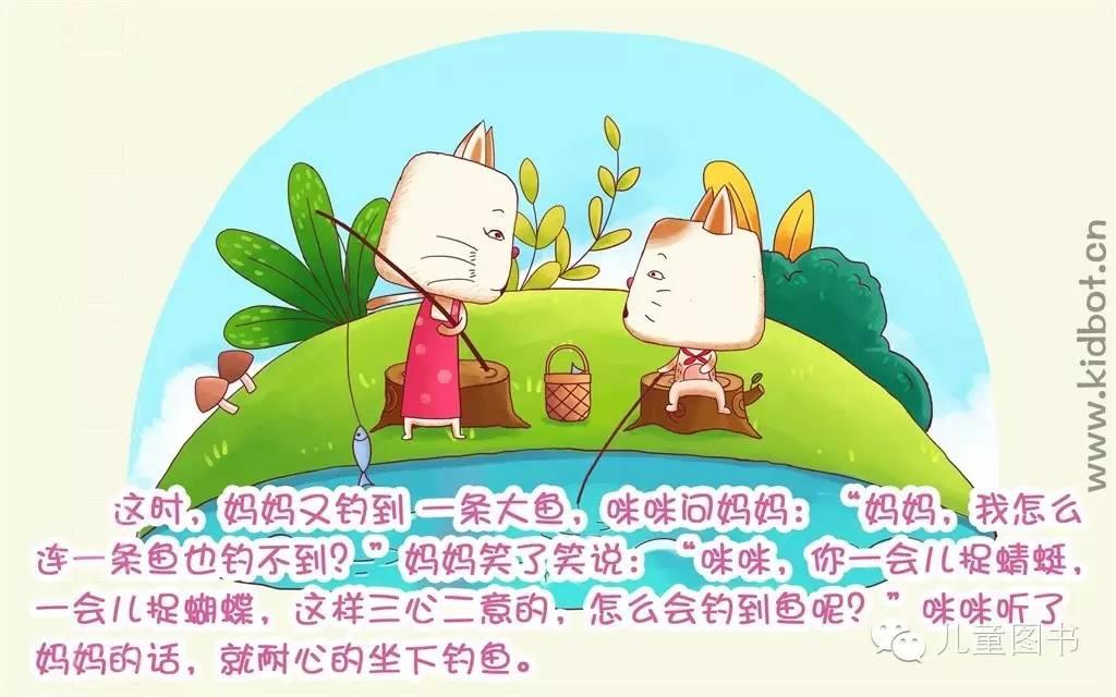 这时,妈妈又钓到 一条大鱼,咪咪问妈妈:“妈妈,我怎么一条鱼也钓不到?”妈妈笑了笑说:“咪咪,你一会儿捉蜻蜓,一会儿捉蝴蝶,这样三心二意的,怎么会钓到鱼呢?”咪咪听了妈妈的话,就耐心的坐下钓鱼。