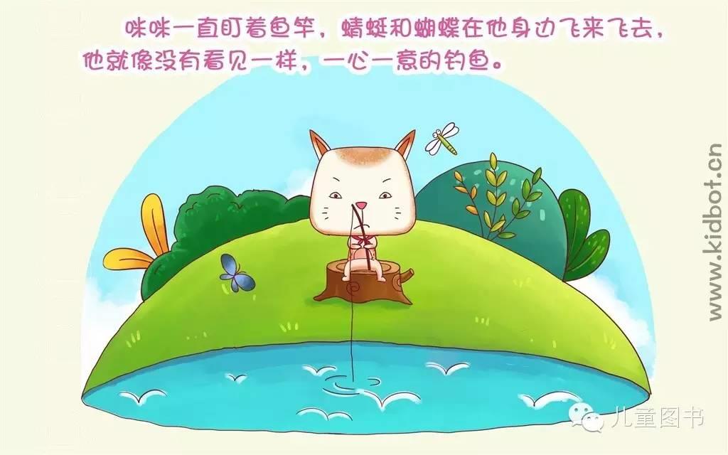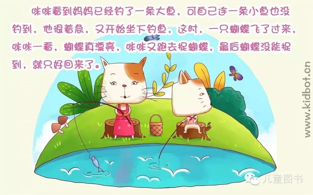 咪咪看到妈妈已经钓了一条大鱼,可自己连一条小鱼也没钓到,他很着急,又开始坐下钓鱼,这时,一只蝴蝶飞了过来,咪咪一看,蝴蝶真漂亮,咪咪又跑去捉蝴蝶,最后蝴蝶没能捉到,就只好回来了。