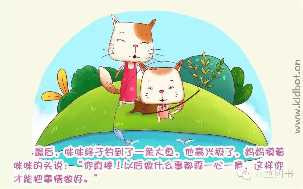 最后,咪咪终于钓到了一条大鱼,他高兴极了,妈妈摸着咪咪的头说:“你真棒!以后做什么事都要一心一意,这样你才能把事情做好。”