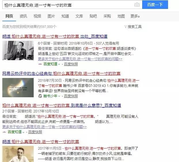 知乎上有个问题是“经典的电影太多了看不完怎么办?”高票回答留下了“怕什么真理无穷,进一寸有一寸的欢喜”这句回答。网上一直盛传这句话出自胡适先生,在百度上随便一搜就是一堆引用。