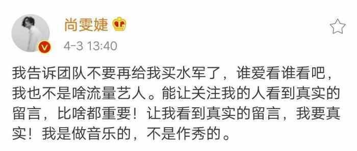 我告诉团队不要再给我买水军了,谁爱看谁看吧,我也不是啥流量艺人。能让关注我的人看到真实的留言,比啥都重要!让我看到真实的留言,我要真实!我是做音乐的,不是作秀的。
