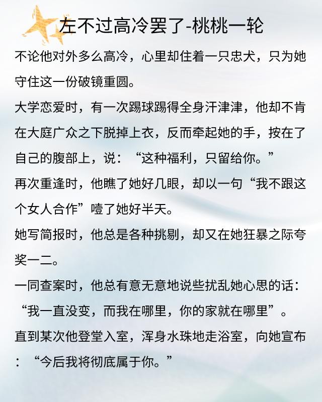 无论是哪本小说,都会围绕着男女主角的身份来展开,如男主是警察的文不少,如《尽欢》、《他来时有曙光》、《左不过高冷罢了》、《那个不为人知的故事》便是此类。