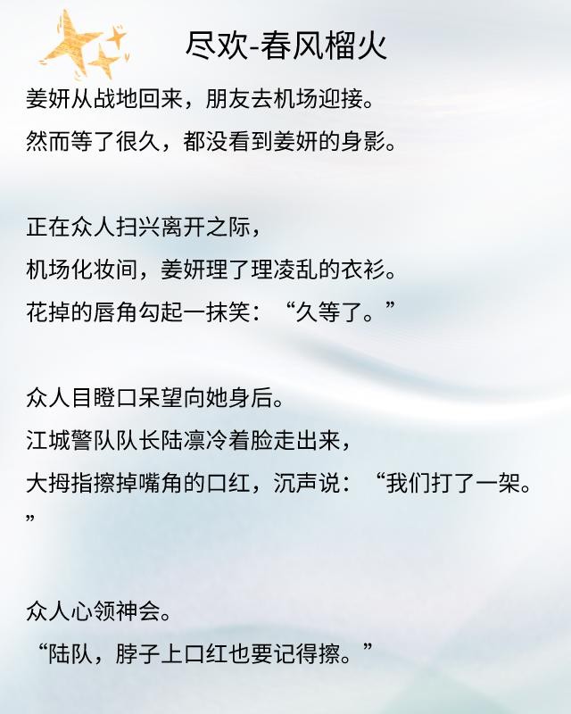 《尽欢》讲述的是姜妍和陆凛的故事,一人是战地记者,一人是警察队长,虽然过程微虐,但全篇看来还是甜的。