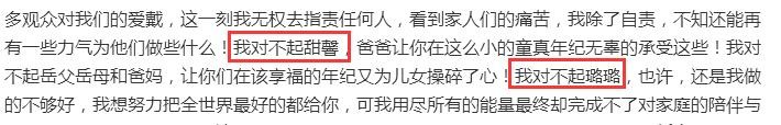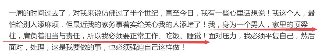 贾乃亮在文中提到他十分痛苦。但他说自己不能倒下,因为“身为一个男人,家里的顶梁柱,肩负着担当与责任”。