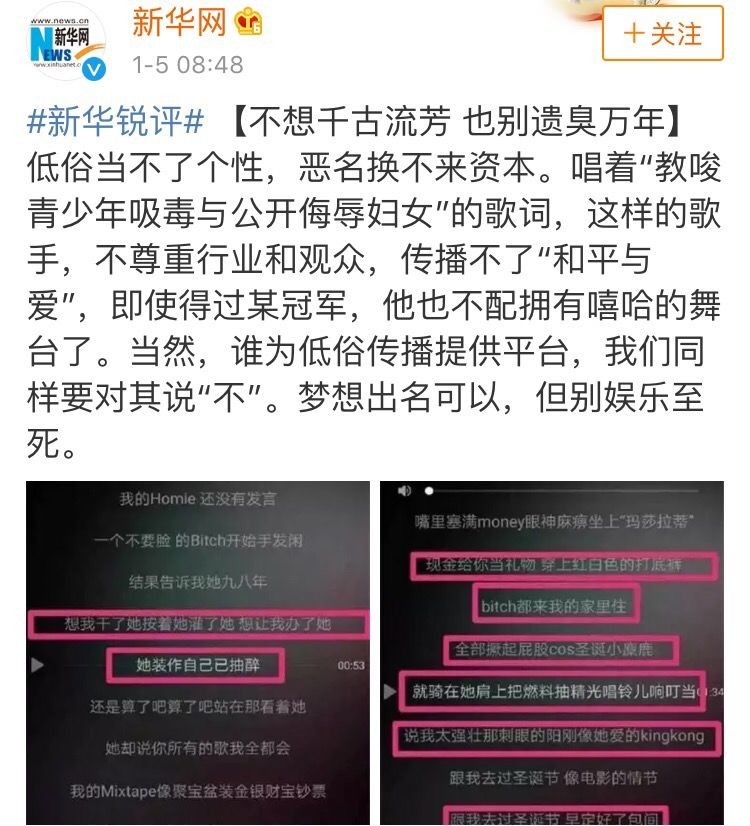 新华网等官V都发微博评论PG One歌词低俗。主要体现这个人没有正能量感,内心想的东西都是不健康的,这样的男人是不会给你带来幸福的!小璐你要三思呀!