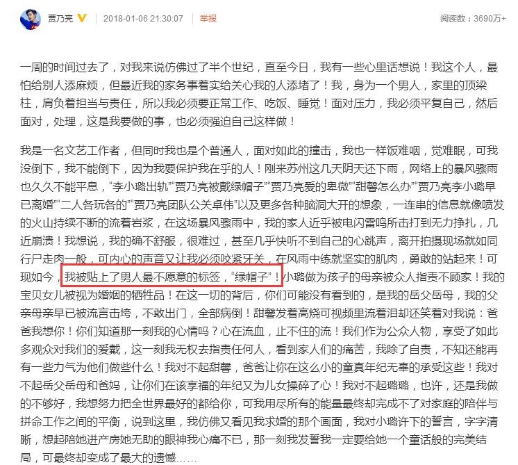 李小璐和PG One「夜宿事件」一周后也就是1月6号贾乃亮在晚上9点半发长文予以回应。从公关角度说,贾乃亮“默认李小璐出轨”的长文堪称完美的复仇!