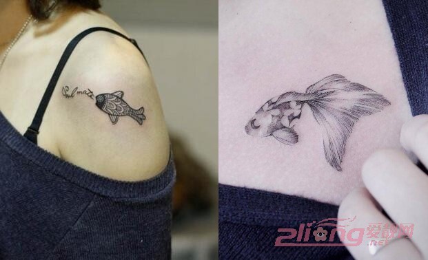女孩子要纹鱼纹身,这样可爱的小鱼图案不是很吸引人吗?左图的鱼纹身利用了简约的弧形与无数线条填充满鱼儿的身体,最后呈现出了别样的异域风格,再从鱼嘴中吐出一蹿英文字,简直不能更有个性。右图的鱼纹身则十分仿真,充满柔和美,以花瓣与月亮作为鱼的花纹,别出心裁。