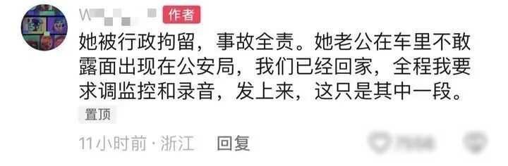 4月13日凌晨,发布者在评论区更新事件进展,称“保时捷女子已被行政拘留,事故责任全在她”。