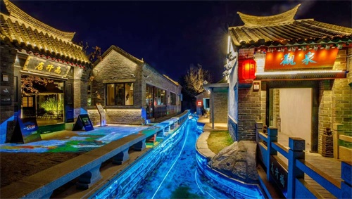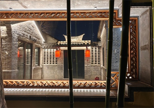 透过玻璃窗,夜色下的西更道街别有一番韵味。古街被暖黄色的灯光笼罩,青石板路泛着微光,两侧传统的民居建筑轮廓在夜色中更显古朴宁静,仿佛诉说着老济南的故事。