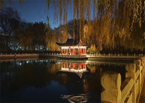 夜色下的济南珍珠泉,泉水清澈如碧,水面折射出斑斓的光芒,与周围的环境相互交织,形成一幅美丽的画面。