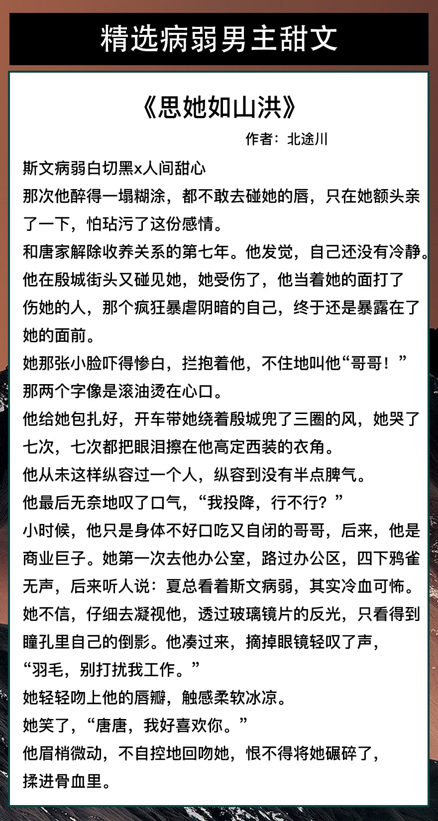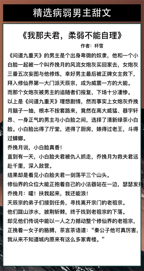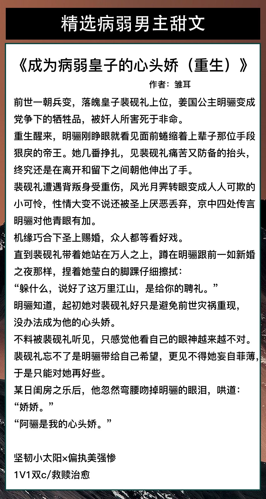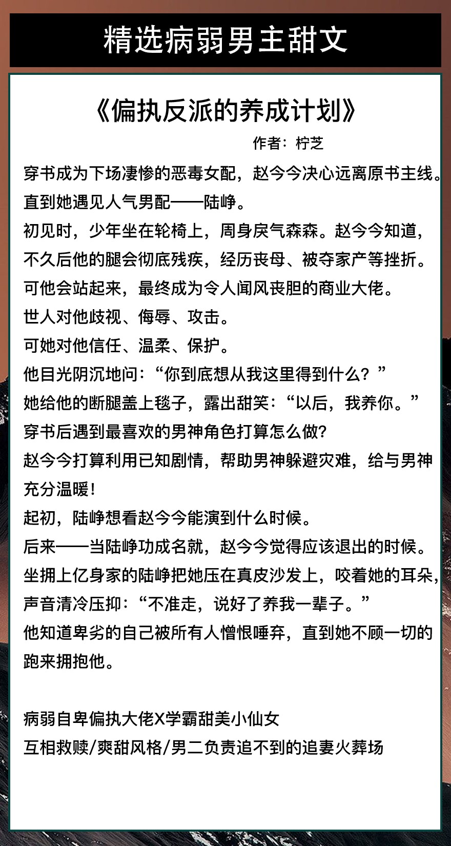 大家好,我是小甜甜,每天给大家推荐好文。这期给大家推荐5本体弱多病,腹黑强大,高智商男主文,男主是个病弱美男,对女主十分纵容宠爱,也是个小可怜,女主的到来让男主灰暗的人生多了许多色彩,男女主人设都非常讨喜,剧情高甜~