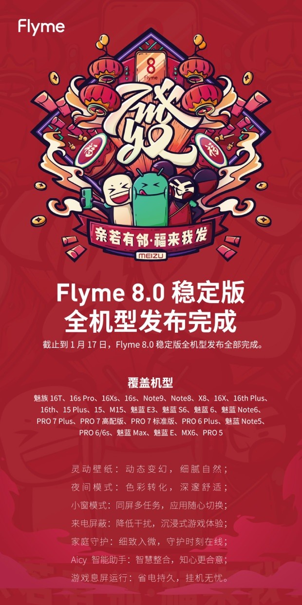 值此新春佳节,魅族放出一个贺岁好消息:旗下28款机型已经完成Flyme8稳定版的推送!让众多魅友乐开了花,还没有升级的魅友抓紧检查系统更新。据悉此次Flyme8覆盖了多款机型,甚至还有将近5年前的PRO5。