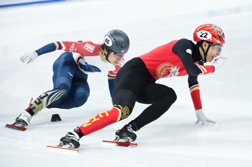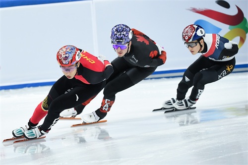 12月7日,韩国选手朴知元(左)、加拿大选手威廉·丹吉努在比赛中冲线。 新华社记者 鞠焕宗 摄