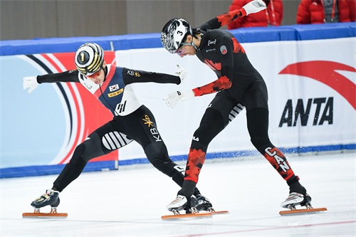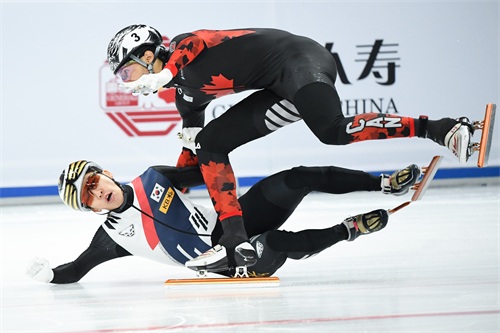 12月7日,韩国选手朴知元(下)与加拿大选手威廉·丹吉努在比赛冲线后相撞。 新华社记者 鞠焕宗 摄