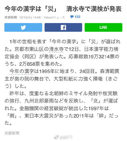 2018日本年度汉字公布:“灾”