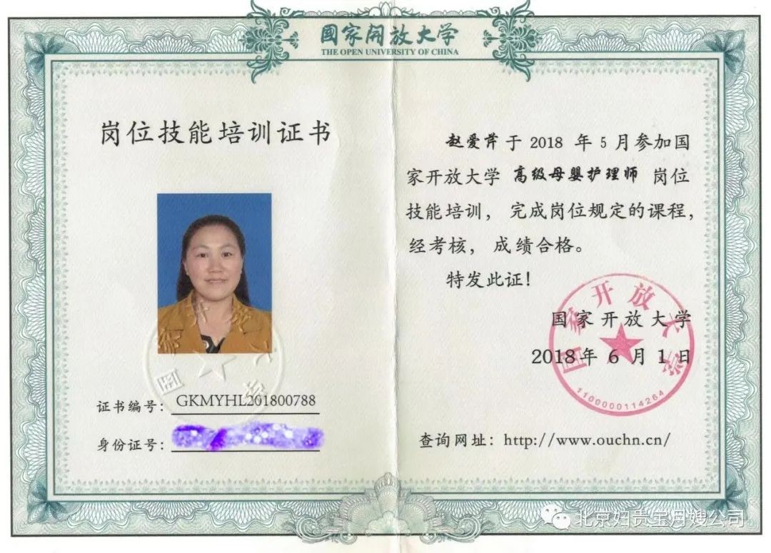 国家开放大学全国通用月嫂证书样板