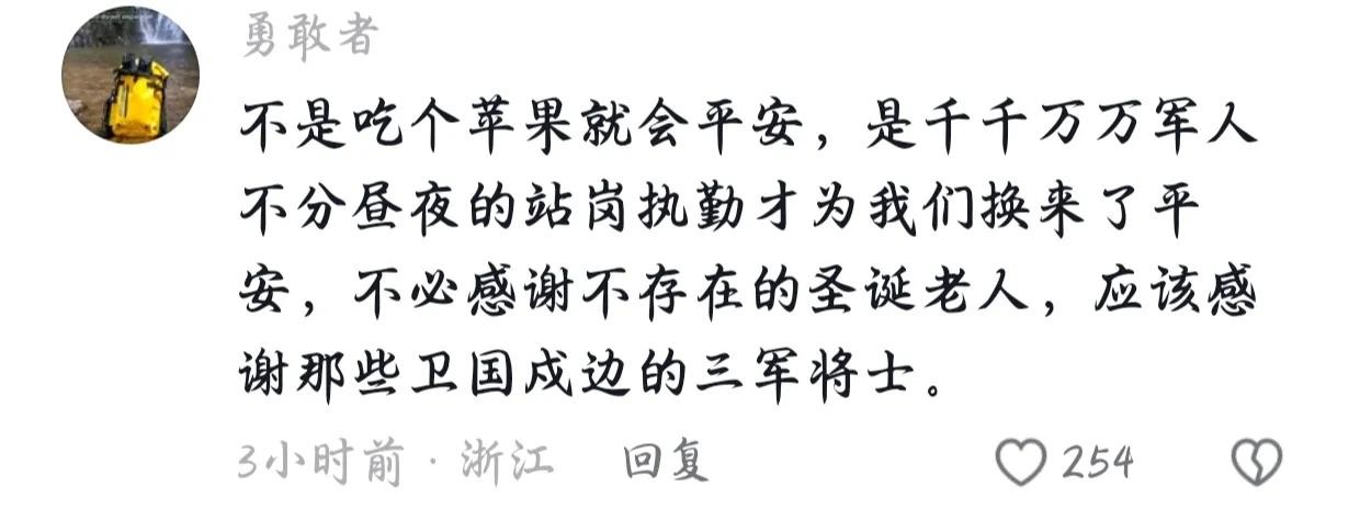 不是吃个苹果就会平安,是千千万万军人不分昼夜的站岗执勤才为我们换来了平安,不必感谢不存在的圣诞老人,应该感谢那些卫国戍边的三军将士。