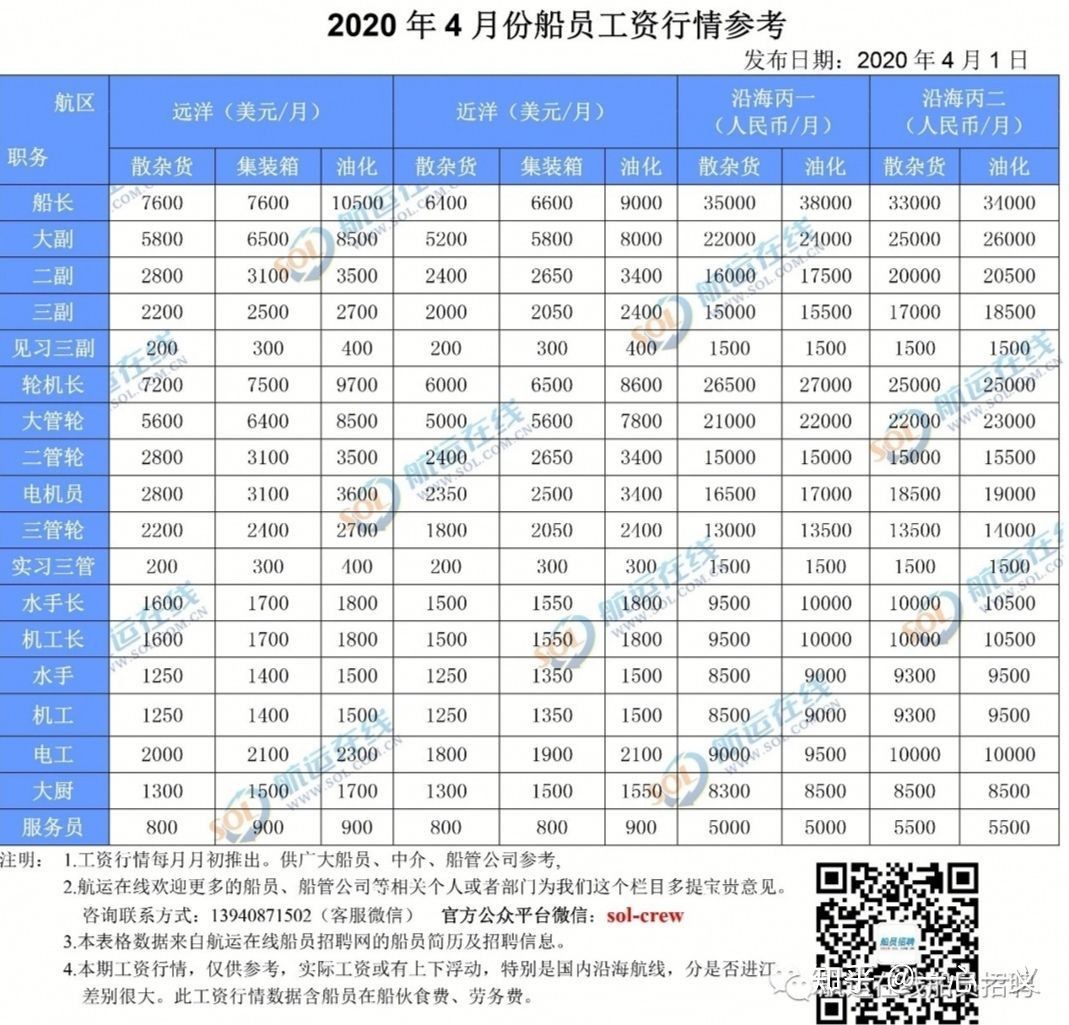 工资详单如下,仅供参考:(图片来自航运在线船员招聘,侵删)