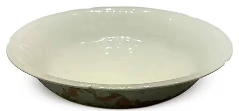 唐,高4.5厘米、口径20.8厘米、底径9.8厘米,1987年陕西扶风法门寺塔基地宫出土。盘呈葵口,釉色青中泛灰黄,碗壁残留当年绘有仕女图的包装纸。(刘志钧)