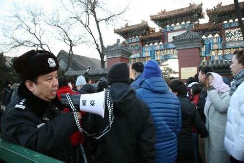 从早7时开始,至上午12时进入雍和宫人数已有3.3万余人。为有序引导现场秩序,东城警方封闭雍和宫大街南北路口及南北两侧并设置4条警戒线。