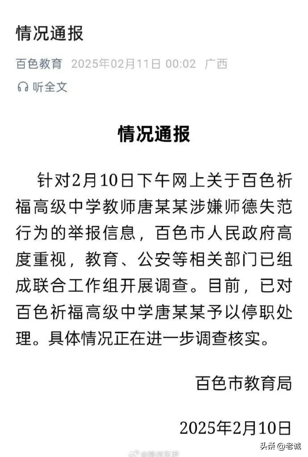 百色祈福高级中学教师唐毓文被指师德失范,市政府已介入调查。