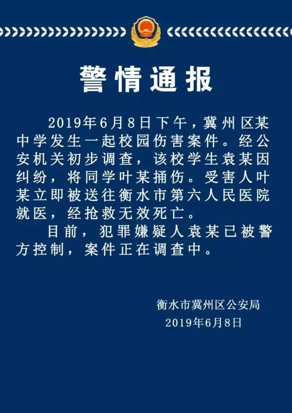 据河北衡水冀州市公安局公众号(jizhougongan)6月9日发布警情通报称,2019年6月8日下午,冀州区某中学发生一起校园伤害案件。经公安机关初步调查,该校学生袁某因纠纷,将同学叶某捅伤。受害人叶某立即被送往衡水市第六人民医院就医,经抢救无效死亡。
