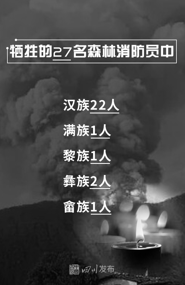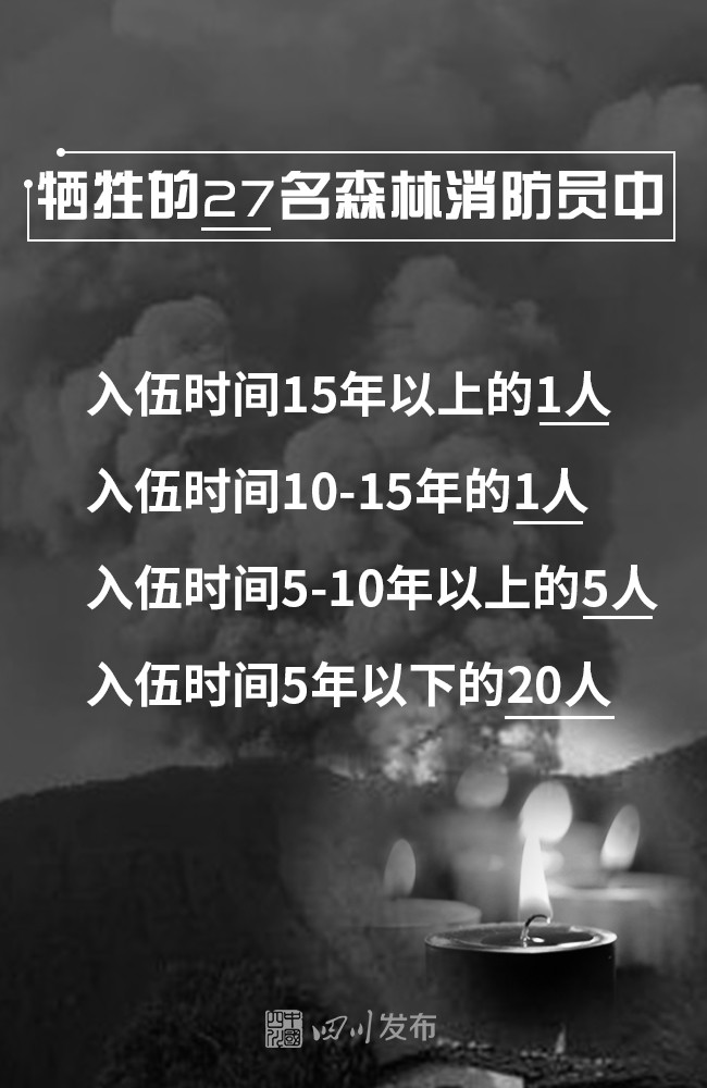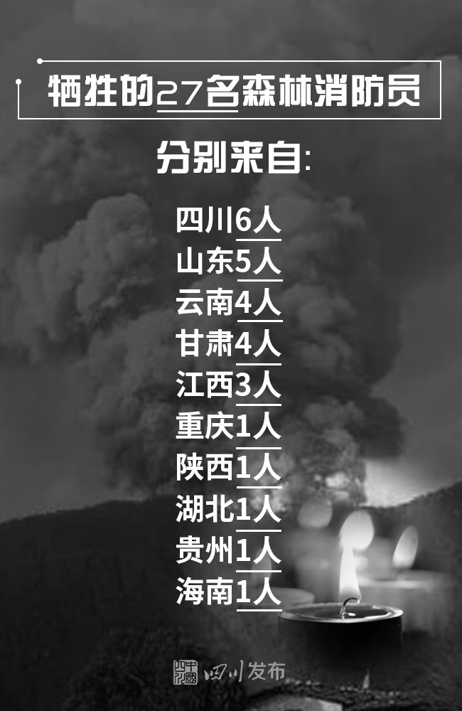 3月31日,在凉山木里县森林火灾扑火行动中,27名森林消防队员和3名地方干部群众牺牲,其中27名森林消防队员大多是90后,还有2名00后的孩子,最小只有18岁。他们来自五湖四海,四川6人、云南4人 、重庆2人、甘肃4人、江西3人、山东5人、陕西1人、湖北1人、贵州 1人。消防员,和平时代最危险的工作之一,但总有人用生命守护人间安宁。