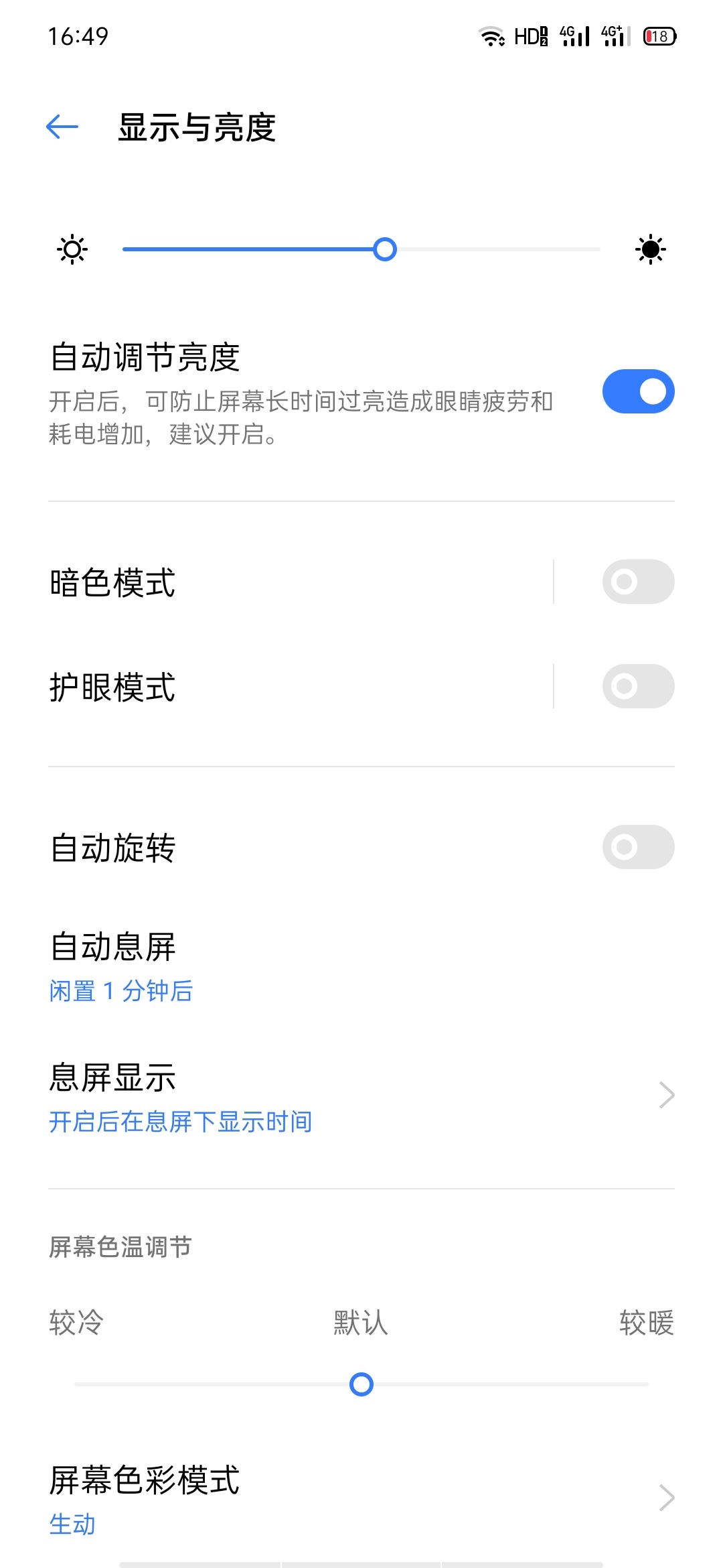 关闭暗色模式和护眼模式以后,屏幕亮度还是变化不大,则可以试着调节下色温,一般调至偏冷色调,会感觉屏幕会稍微量些。