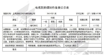 【三体将拍电视剧? 预计9月开拍共24集】据报道,知名科幻小说《三体》要拍电视剧了。广电总局5月电视剧备案公示显示,电视剧《三体》通过备案,由上海游族文化传媒有限公司出品,预计今年9月开拍,共24集,制作周期12个月。值得一提的是,早在2016年,剧版《三体》就出现在备案信息中,不过电视剧迟迟未与观众见面。你支持《三体》拍剧吗?期待谁来主演?