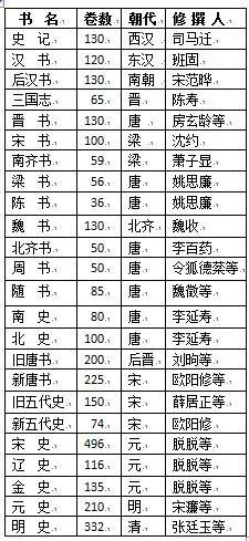 清乾隆时,《明史》定稿,诏刊二十四史,又诏增《旧唐书》,并从《永乐大典》中辑出薛居正《旧五代史》,合称二十四史。流行的二十四史有两种版本,一为武英殿本,即清代官刻本。清末以来各种翻刻本大体以此为依据。一为商务印书馆的百衲本,集合各史较早刻本影印,原书刻误多据殿本修改,但也有误改之处。新中国成立后对二十四史加以整理、标点,为研究者提供了很大方便。二十四史卷数、修撰者、朝代与姓名如下表: