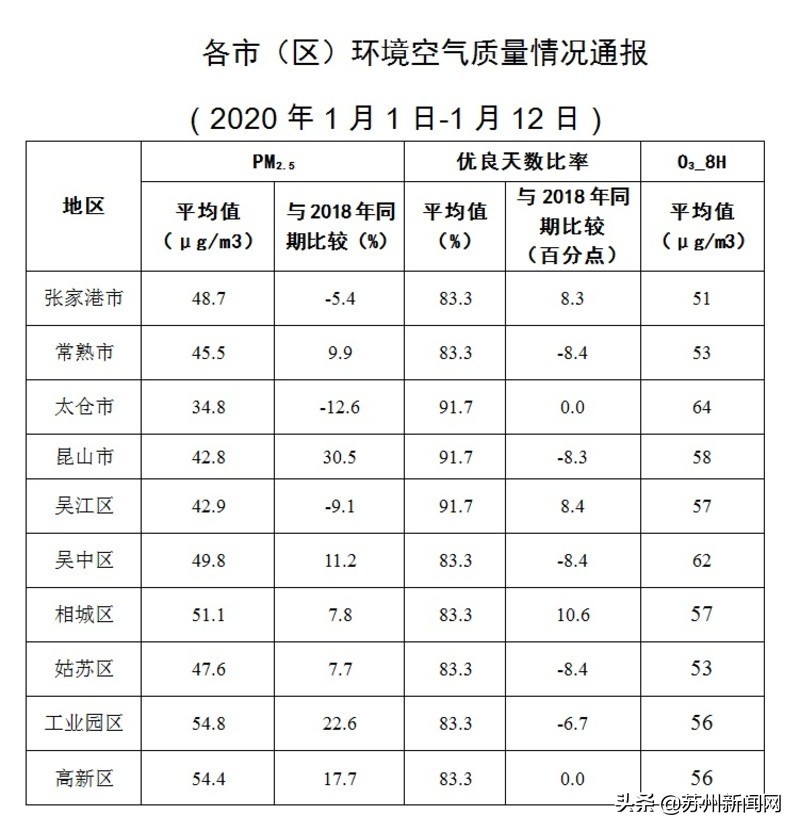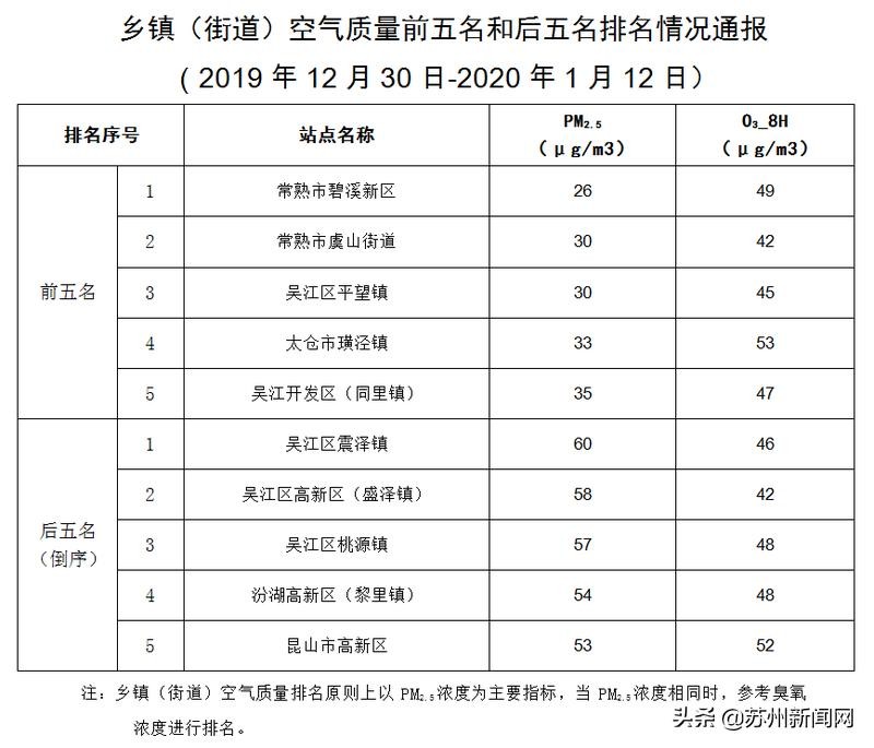 今天(1月17日),苏州市大气办通报各市(区)空气质量改善情况和乡镇(街道)空气质量前五名和后五名排名情况。据悉,环比前两周,全市乡镇(街道)排名下降幅度较大的5个地区,依次为:昆山市陆家镇、昆山市张浦镇、常熟市琴川街道、吴中区城南街道、张家港市双山岛。(苏报融媒记者 惠玉兰)