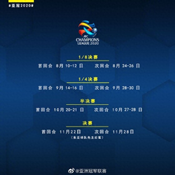 北京时间3月9日,亚冠联赛官方发布亚冠淘汰赛最新安排,亚冠淘汰赛赛程再次更新,决赛首回合将于11月22日举行。