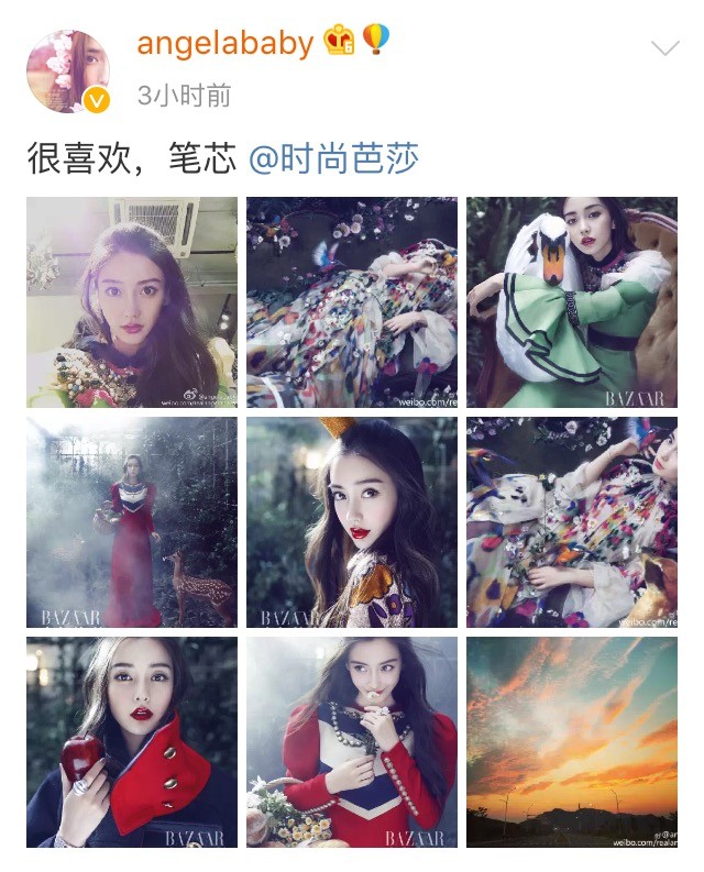 再次为时尚巴莎拍摄封面,angelababy大红唇闪亮亮着实惊艳。