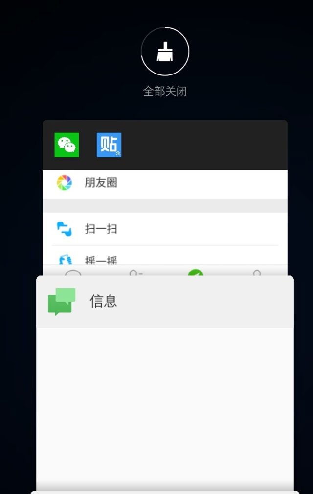 3.如果我们再次浏览最近打开的应用卡片,会看到开着微信和贴吧的分屏卡片会同时显示这两个应用的图标。