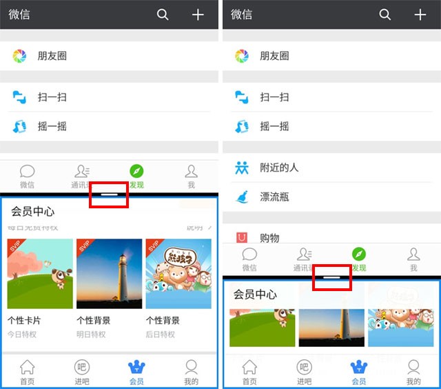 2.这时上下两个屏幕分别展示了微信和贴吧两个应用。我们可以按住屏幕分割线里的白色色块上下拖动,调节两个屏幕的高度。