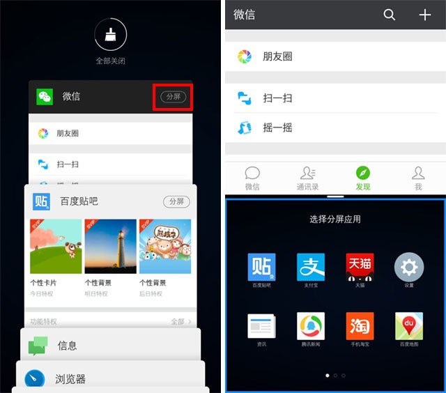 想将一个界面分为两个屏幕,一个屏幕开微信,一个屏幕开贴吧?魅族手机的应用分屏功能可以实现。