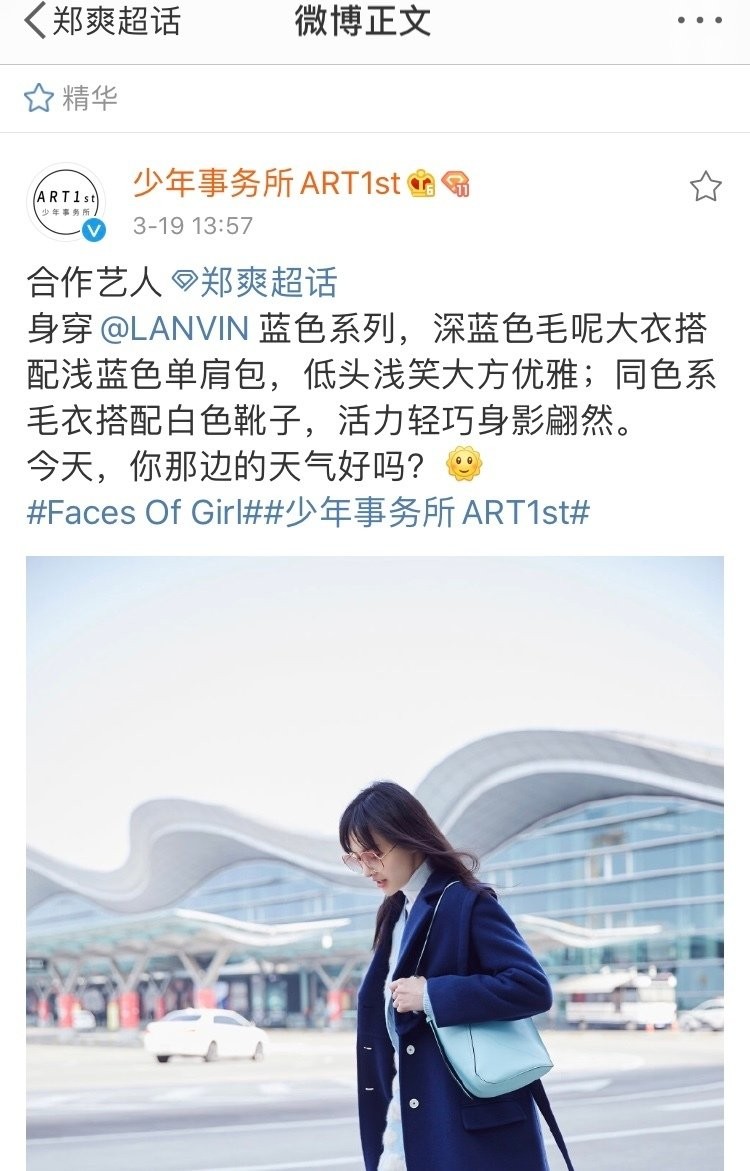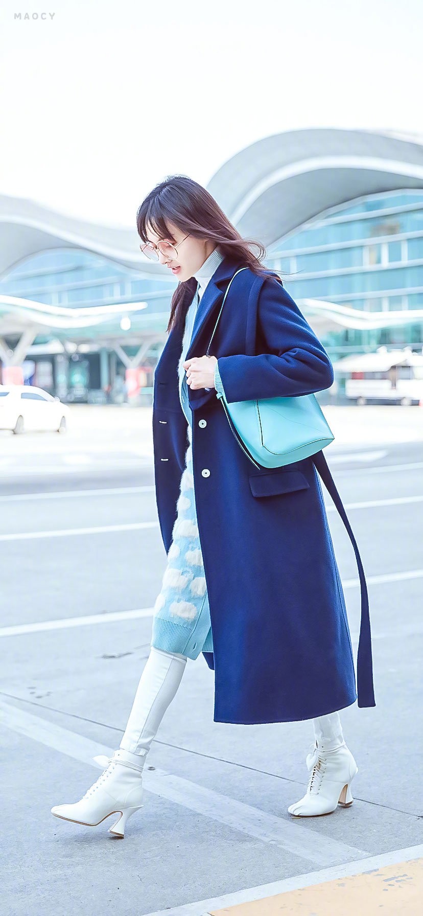 郑爽最近曝光一组机场街拍,利落的大衣搭配温暖的针织衫,白色的长靴还有天蓝色的水桶包包,这些少女感的造型让郑爽看起来活力十足,具有俏皮的气息。大家赶紧学起来吧!做一个春天里的美少女