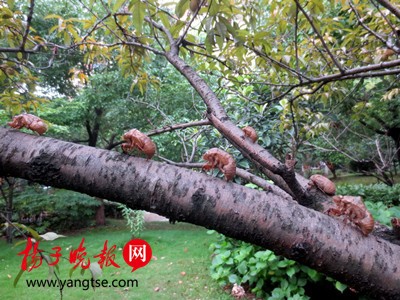 扬子晚报网7月12日讯(记者 梅建明 通讯员 武家敏)今天早上,南京鼓楼区金域中央小区一棵棵树上,一只只“知了猴”在风雨过后的湿润土地上破土而出,脱下夏装,纷纷爬上树梢演奏“交响乐”,给雨后的闷热天带来了夏趣。 据介绍,夏季来临,每当雨后,“知了猴”纷纷就会借着松动的泥土,钻出地面,随后慢慢爬到树上,开始进行蜕壳,最后展翅飞走,开始唱响不超过60天的短暂生命旅程。