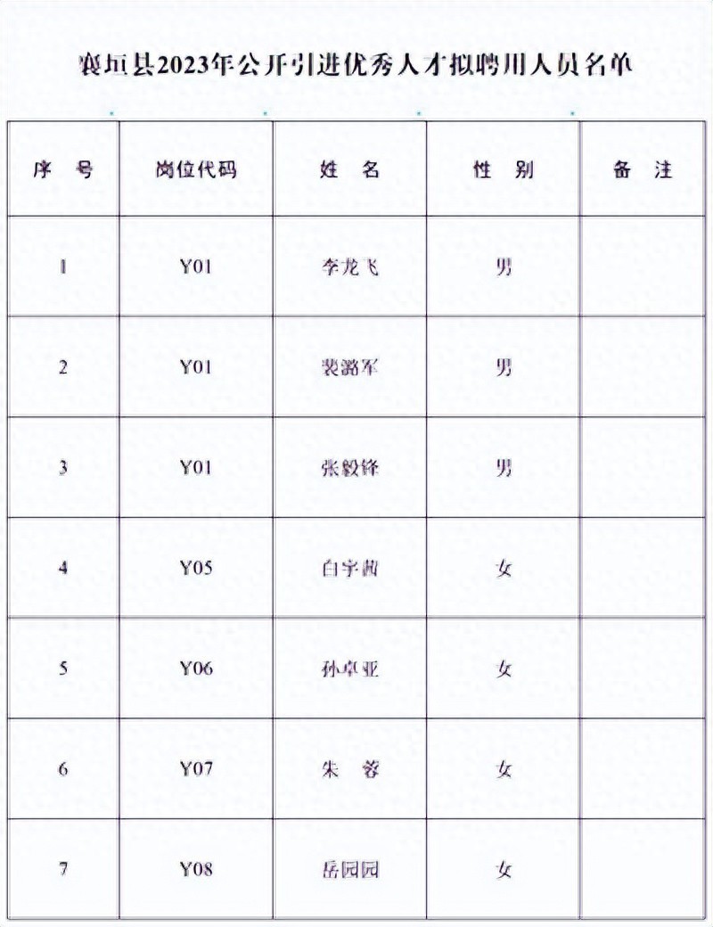 根据《襄垣县2023年公开引进优秀人才公告》规定,经报名及资格审查、面试、体检、考察等程序,共确定拟聘用人员7名。现予以公示(名单附后)。